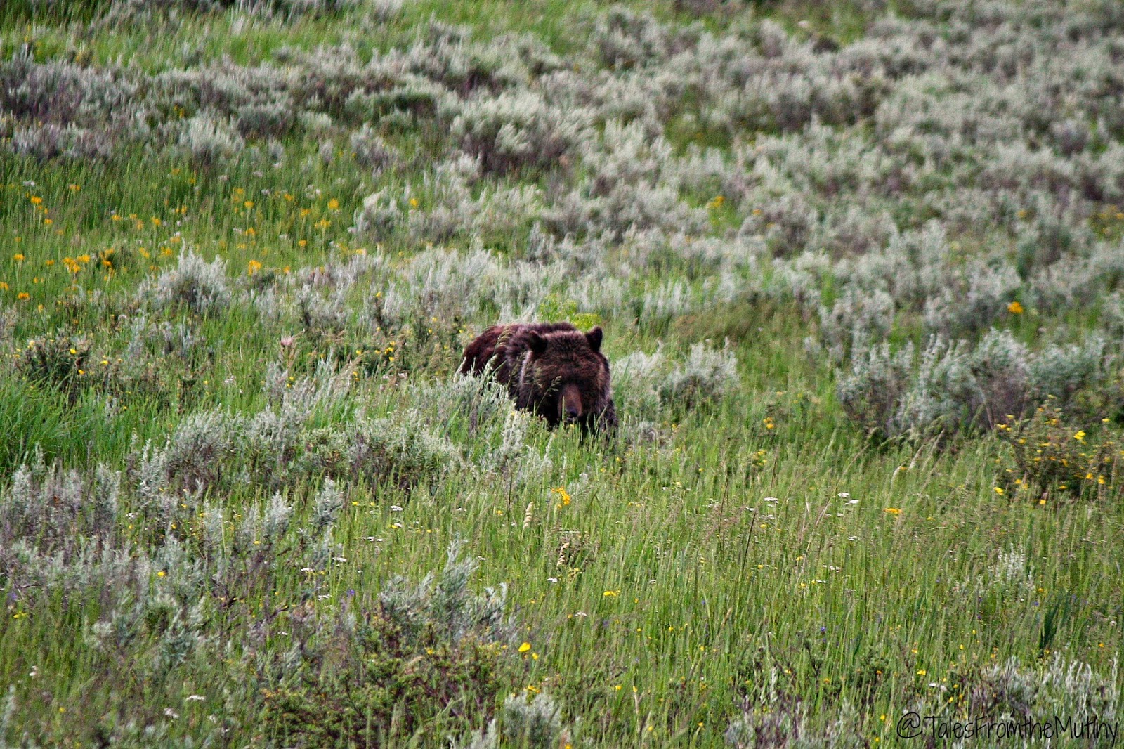 Grizzly or black bear? We’re used to seeing Black Bear with a black body and brown points on the face but they range in color from black to cinnamon and are often mistaken for grizzlies. However, I’m not sure which this is…I just know enough to keep safe and IN my vehicle.