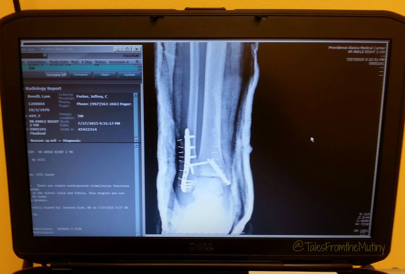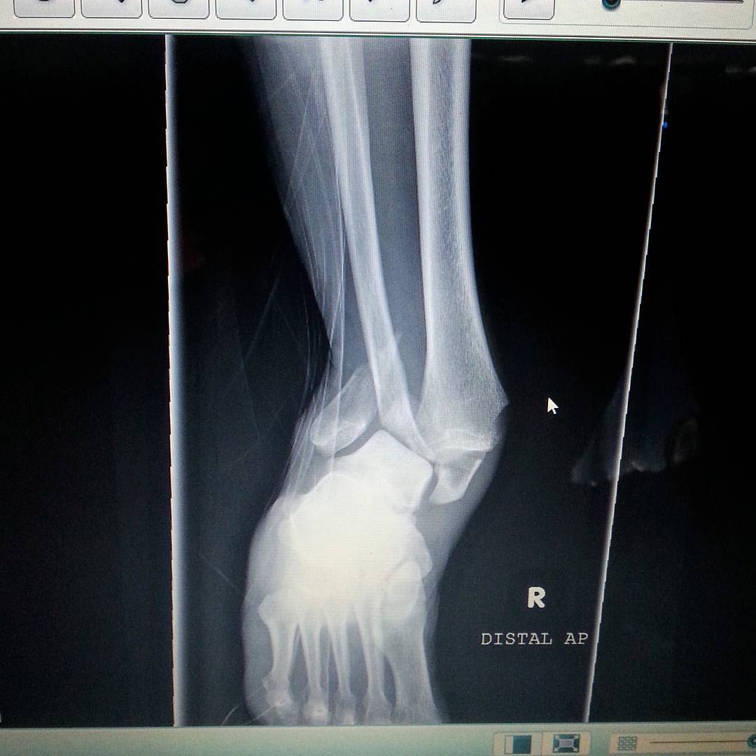 | The x-ray showing the multiple fractures and severe dislocation. FYI: one’s ankle should not look like this… |