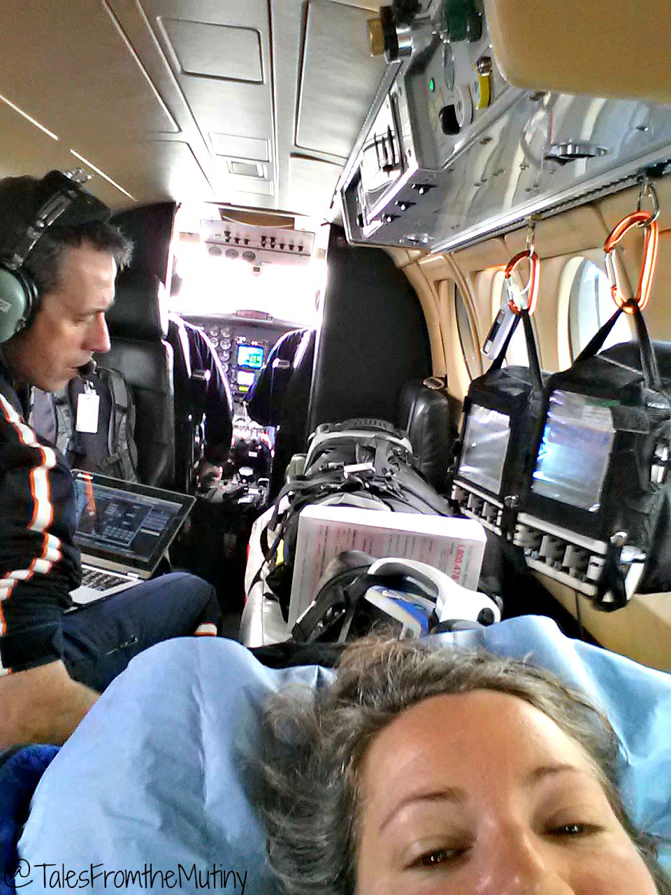 Some time after 9am the LifeMED arrived at the tiny airstrip in Seward. Once again Isaac, the singer/EMT, showed up to transport me via ambulance to the plane (apparently he didn’t sleep much either). The amazing LifeMED Alaska crew and paramedics secured me in the back of a plane so small that not another person could have fit (I think there were 5 of us including me). They also gave me some pretty good drugs while I joked that this was some strange way for me to finally get an aerial view of Exit Glacier (not knowing that we actually would fly over it). One of the paramedics was nice enough to grab my cell phone and snap a couple of photos for me…and of course, I took a selfie in the plane. After all, it’s not every day you get airlifted in an emergency situation.