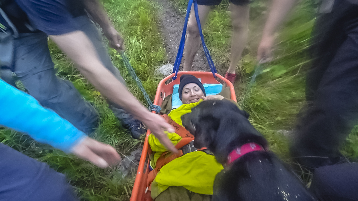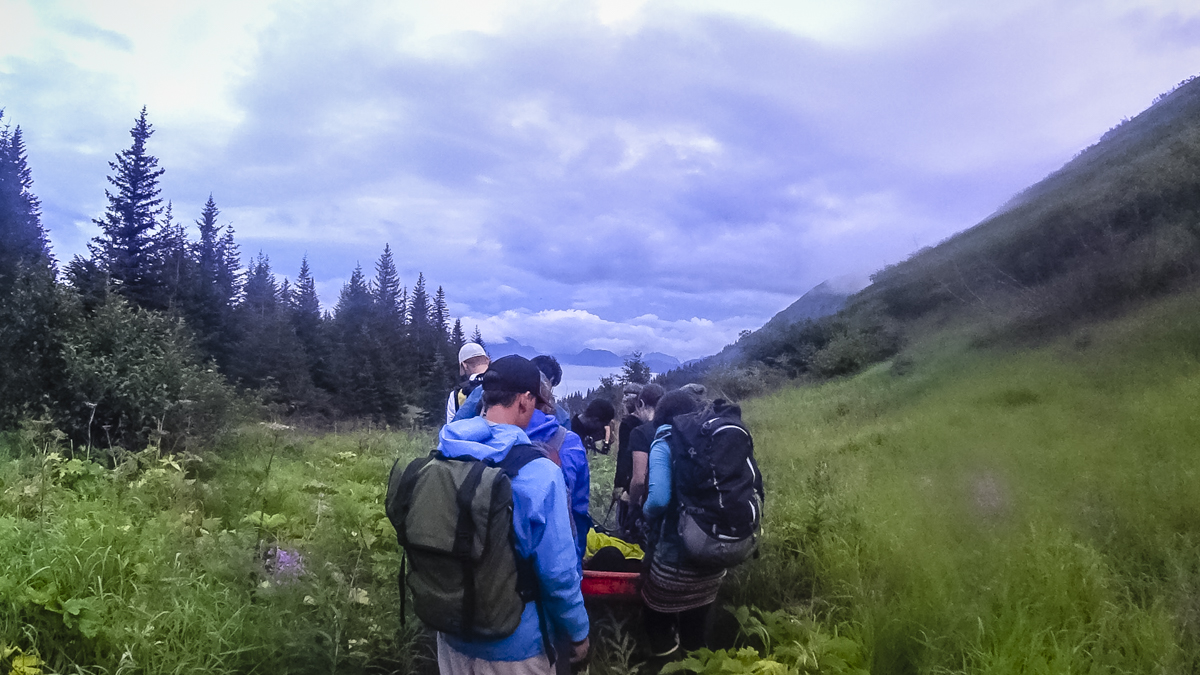 Due to low clouds a helicopter was out of the question (darn it, I’ve never been in one of those). It took about 45 minutes for the Seward Volunteer Fire Department to arrive on scene. They were only able to drive their Jeep up the trail a mile before the rescue crew was forced to hike in. Once they arrived Amy (hero!) explained everything that would happen and how the rescue would take place. These men and women were going to painstakingly carry me off that mountain to where the Jeep waited. I was strapped onto the stretcher and prayed no one else would get hurt carrying me down to safety.