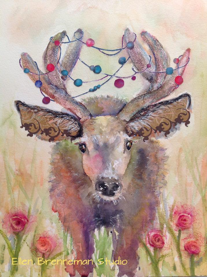 | Ellen’s mixed media Mule Deer was inspired by our encounter with the deer on the trail (see photo above). Check out her Etsy store for prints as well as her stunning series of Spirit Animals. |