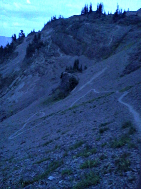 | The final mile of the trail was this barren, steep section of single track. It was getting very dark, hence the blurry photo. |