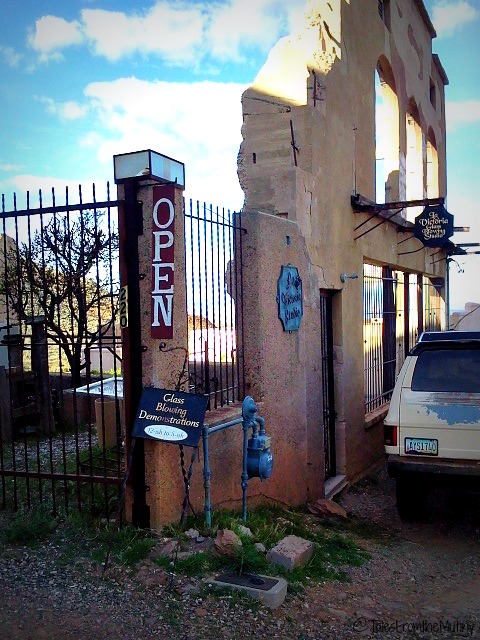 La Victoria Glass Blowing Studio ~ Behind Raku is a funky old dilapidated building with something really, really cool inside. A kiln, glory hole, torches and powdered glass occupy at least half the shop while several shelves display the magnificent blown glass art of Tracy Weisel. Several chairs are set up so you can sit a while and watch the whole process, from beginning to end, as he explains each step. The day we went he was making glass pears and they were stunning. A worthy stop anytime you’re in Jerome.