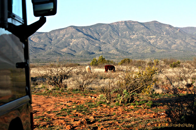 | The view from our free spot on Thousand Trails Road in Cottonwood. Note the red clay…if it rains you might be stuck for a few days. |