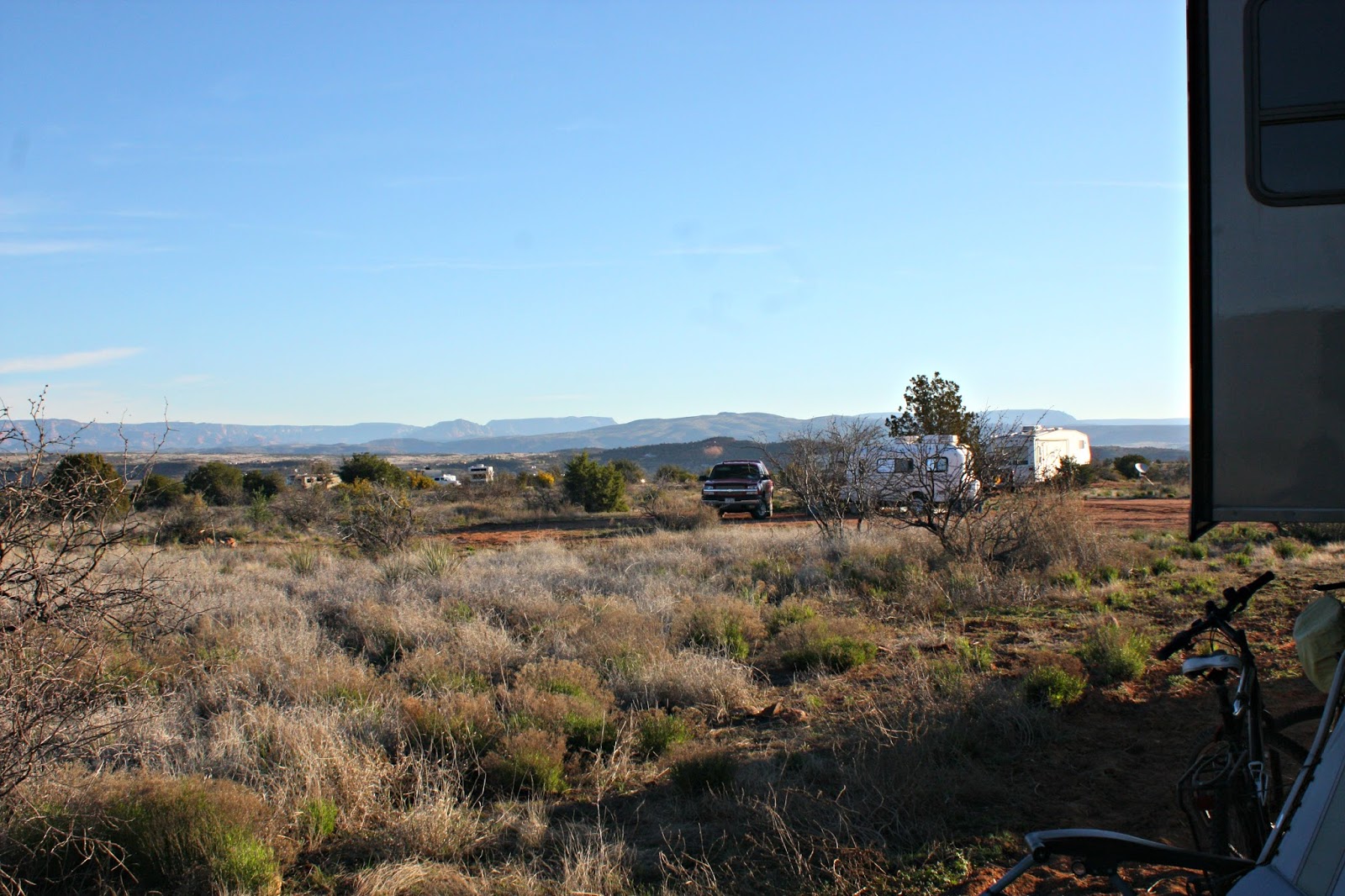 | The view from our free spot on Thousand Trails Road in Cottonwood. Note the red clay…if it rains you might be stuck for a few days. |