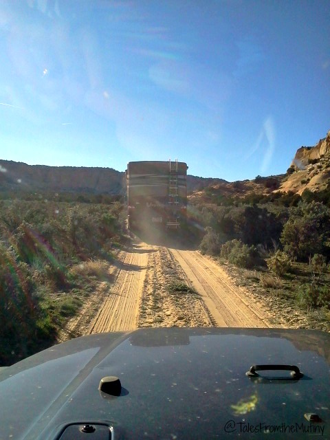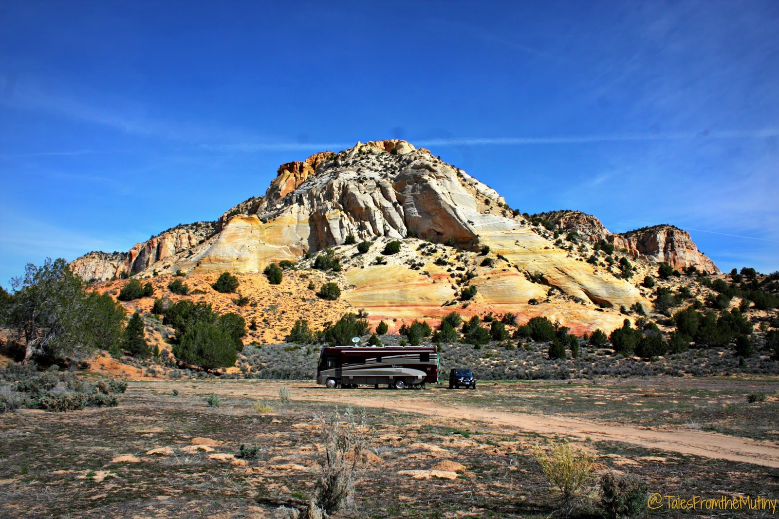 Since it’s run by the BLM there are many boondocking opportunities, unlike most National Parks which only allow camping in developed campgrounds. But, being newbies to the whole “finding appropriate campsites we could fit in” we struggled for a while to find a suitable spot. We tried the gravel pit at the BLM contact station (too far from our destination) and the Paria Movie Set site (not big rig friendly unless you want to park along side Highway 89). We took a chance and headed up Johnson Canyon Road. As daylight was fading we were hitting a brick wall. In an act of desperation we disconnected the Jeep and we scouted an almost invisible dirt road we’d passed earlier. The scrub on the sides of the road was overgrown enough to touch the sides of the Jeep but it opened up to the most beautiful camping spot we’d ever seen. And no one else was there. We knew taking the Mutiny down this road would result in some new “pinstripes” but we felt the campsite was worth it. And it was.