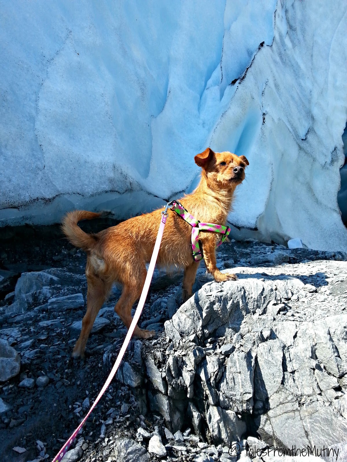 | Nellie has her “weird ears” on…she did not like being this close to the glacier (but she did like drinking from it) |