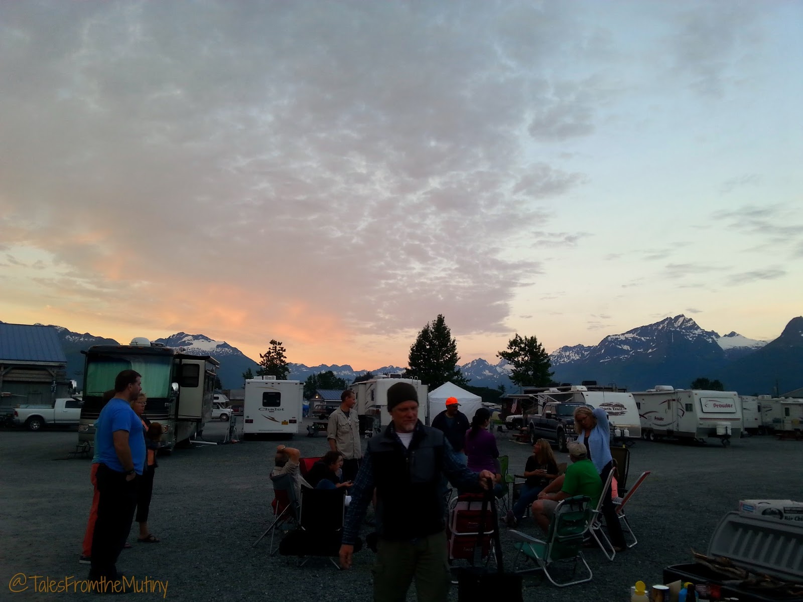 | A beautiful midnight “sunset”. If you’re gonna stay at a crowded RV park you might as well make friends, eat some just caught halibut and share some great stories. |